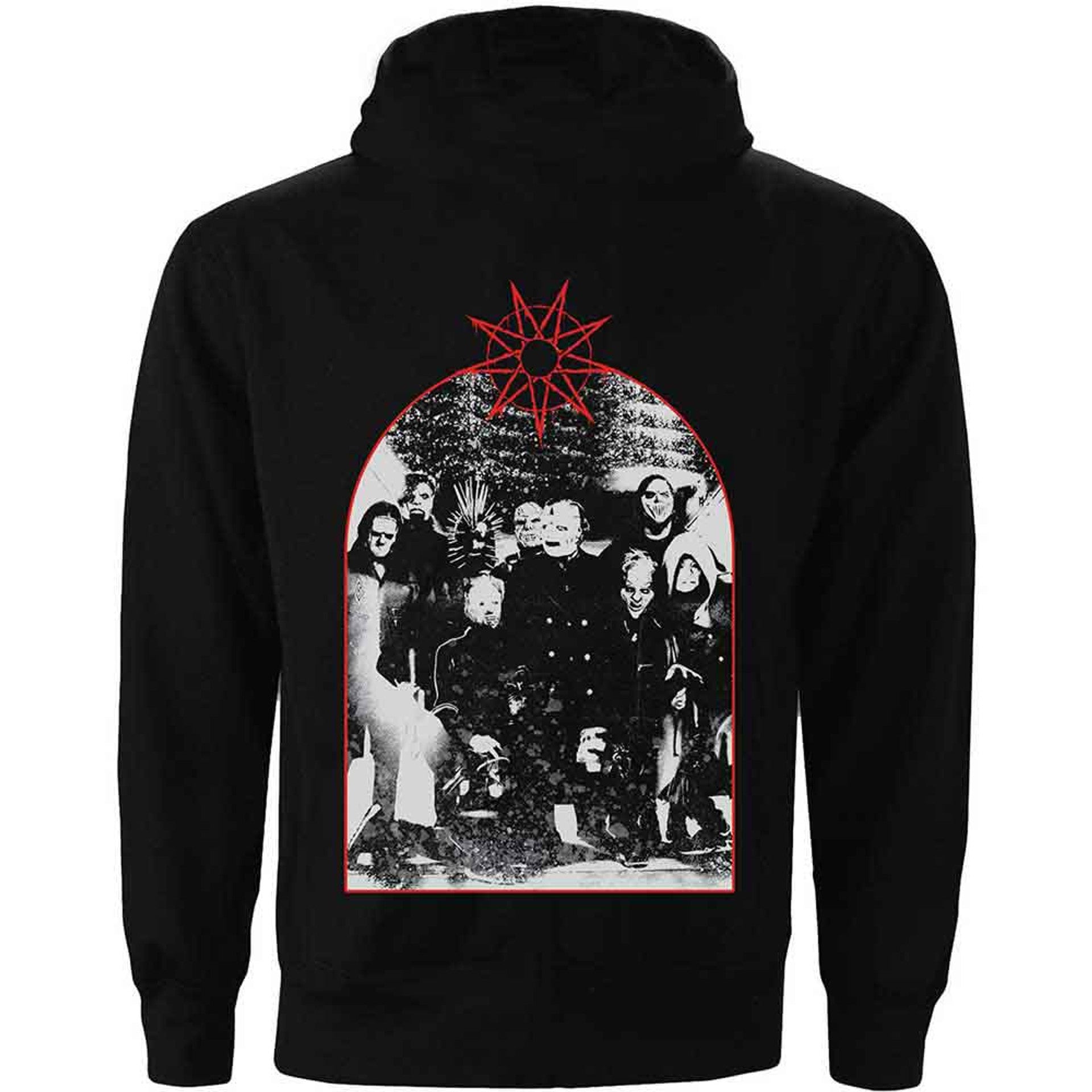 Rock out in style with this Slipknot Unisex Pullover Hoodie, featuring the iconic band's arched group photo blazing across the back.
