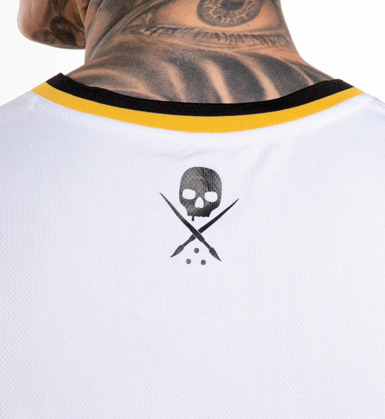 Clean white mesh with gold and black hits—this jersey keeps it sharp without trying too hard. Sullen lettering across the chest with just enough shine to catch a second look. Lightweight, breathable, and ready for whatever heat the day throws at you.